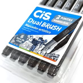- Versatilidade: Marcador artístico DUAL Brush CiS com duas pontas – pincel e fina – para traços variados. - Tons de Cinza: Estojo com 6 cores perfeitas para sombreamento, ilustrações e lettering. - Aquarelável: Tinta à base de água que permite efeitos de degradê e mistura de cores. - Contém 6 Tons de CINZA - Canetas com DUAS pontas: Brush e Fine - Tinta à base de água - Caneta para lettering