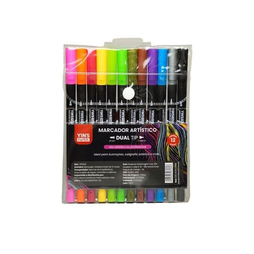 Marca: Yins?Paper Modelo: Estojo Dual Tip 4/1?mm (ex: YP9512) Tipo: Marcador permanente com duas pontas (fininha + chanfrada) Ponta fina: 1?mm Ponta chanfrada: 4?mm Quantidade: 12 cores Material do corpo: Plástico resistente Uso indicado: papel, desenho, design de moda, arquitetura, artesanato, uso criativo Peso estimado: ~180?g