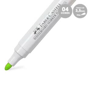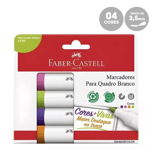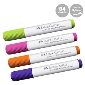 Marcador de quadro branco 4 cores faber castell tamanho do traço: 3,5mm cores: roxo, rosa, verde e laranja tinta à base de álcool para secagem rápida tinta versátil, pode ser utilizado e apagada tanto em quadro branco, quanto em vidro. Fácil remoção com flanela ou apagador
