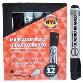 Marcador para quadro branco preto - jocar office c/12Características do produto:Traço de 23mm.Secagem rápida.Atóxico.Composição: resina termoplástica, ponta de fibra e tinta à base de corantes e solventes.Descrição:Cor: pretoAltura: 132mm.Diâmetro: 18mm.Marca: jocar officeCaixa: com 12 unidades