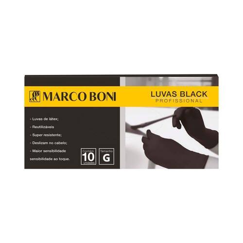 Marco Boni Luva Látex Black G C/10 DESCRIÇÃO:Luvas em Látex Black G Marco Boni são ideais para profissionais que trabalham com processos químicos, como coloração e alisamento.AÇÃO/ATIVOS:Produzido em látex na cor preto, é super resistente e reutilizável. Dispensa uso de talco. Desliza facilmente nos cabelos e ainda possui maior sensibilidade ao toque. Imagem meramente ilustrativa. O produto pode ter variação de cor ou desenho, porém as características gerais são as mesmas especificadas na descrição do produto.MODO DE USAR:Coloque as luvas cuidadosamente, é recomendado retirar anéis ou outros acessórios que possam perfurar a ESTE KIT CONTÉM: 01 UNIDADE DE MARCO BONI LUVA LÁTEX BLACK G C/10Marco Boni Luva LÃtex Black G C/10