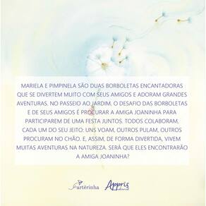 Mariela e Pimpinela são duas borboletas encantadoras que se divertem muito com seus amigos e adoram grandes aventuras. No passeio ao jardim, o desafio das borboletas e de seus amigos é procurar a amiga joaninha para participarem de uma festa juntos. Todos colaboram, cada um do seu jeito: uns voam, outros pulam, outros procuram no chão. E, assim, de forma divertida, vivem muitas aventuras na natureza. Será que eles encontrarão a amiga joaninha?