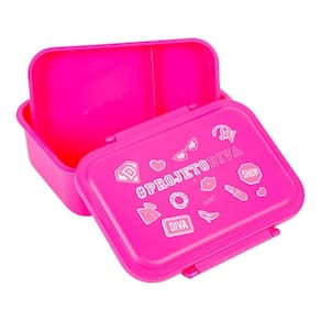 Contém: 1 pote com capacidade de 1,3l, 1 pote removível com divisória e capacidade de 480ml, 1 tampa com duas travas laterais.