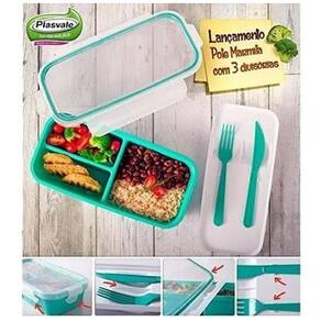 A Marmita 3 Divisórias Plasvale possui capacidade de 1,2 litros e divisórias que facilitam na hora de armazenar o alimento. Além disso, é hermética e possui travas que garante maior segurança na hora de transportar. Acompanha bandeja com garfo e faca, perfeito para quem leva suas refeições para o trabalho e atividades de rotina. Vai ao micro-ondas e é BPA Free, atóxico, que garante segurança na hora do lanche ou refeição. Você poderá armazenar comidas quentes e frias com praticidade e facilidade