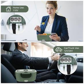 Desfrute de refeições quentes e saudáveis Esta lancheira para aquecer alimentos faz com que você desfrute de refeições caseiras quentes e saudáveis, sem a necessidade de micro ondas. Ligue o 30 minutos a 1 hora antes das refeições para auto aquecimento, você terá um almoço quente e não precisará pagar por fast food. Dica recomendamos adicionar um pouco de caldo ou água aos alimentos para um aquecimento mais rápido e uniforme. Não adicione água à base de aquecimento Não adicione água à base de aquecimento 2 em 1 carro e uso doméstico lancheira de aquecimento elétrico contém dois plugues diferentes um para trabalho, casa 110 v, um para carro, caminhão 12 v, 24 v. Pessoas que estão na estrada para almoçar ou sem acesso a micro ondas, como motorista de caminhão, , funcionário de escritório, podem desfrutar de comida caseira quente no carro, escritório. Tampa de vedação aprimorada A junta de vedação à prova de vazamento é instalada na tampa para uma melhor vedação para evitar que alimentos líquidos derramem. Para fechar a tampa corretamente e com mais suavidade, trave primeiro os fechos curtos e depois os fechos longos. O líquido pode vazar da porta de vapor na tampa, portanto, não vire a lancheira de cabeça para baixo. Material e fácil de limpar Lancheira aquecida portátil feita de plástico PP premium e aço inoxidável 304, que é e durável. Contém um recipiente de aço inoxidável removível de 1,5L e uma caixa de plástico de 0,45L para zenamento, podem ser lavados na máquina de lavar louça. Dicas quentes não limpe a base de aquecimento com água, não adicione água à base de aquecimento para evitar curtos circuitos