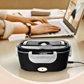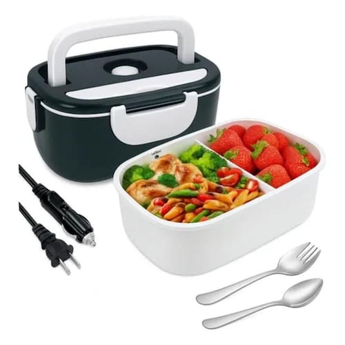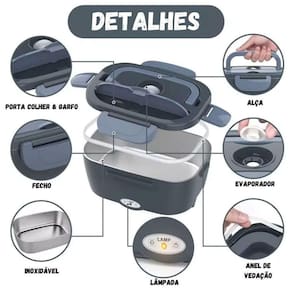 Marmita elétrica portátil 2 em 1, ideal para casa, carro e Uber. Capacidade de 1,5L. Aquecimento rápido e eficiente. Válvula de silicone na tampa para liberação de vapor. Inclui porta-talher com colher.Lâmpada piloto