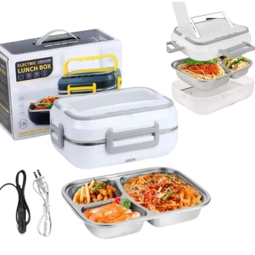 Trava nas laterais para que a tampa fique bem fixa e fechada, Repartições para separação de alimentos, Suporte talher, Material: plástico pp de grau alimentício e aço inoxidável 304, Dimensões: 22cm x 17cm x 11cmLâmpada piloto