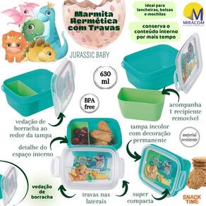 Pote Marmita com fechamento Hermético por vedação de borracha, com Trava Dupla, retangular, colorido e com tampa incolor com decoração permanente. Tem capacidade para 630ml. Conta ainda com 1 compartimento removível para melhor acomodação e separação dos alimentos. Conta com decoração dos personagens infantis mais queridos pela criançada: Jurassic Baby. O produto é fabricado pela Plasútil e é oficialmente licenciado pela marca.