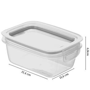 Para uma melhor higienização, o pote é composto exatamente por 3 peças, à saber: 1 recipiente principal retangular, 1 tampa com borda de borracha e trava dupla e 1 recipiente ovalado extra de encaixe para separação do conteúdo interno.