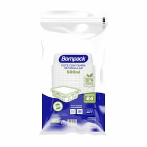 Informações Técnicas Marca: Bompack Modelo: Pote Retangular Com Tampa 500ml Material: Polipropileno (PP) Capacidade: 500 ml Contém: 24 un Transparente