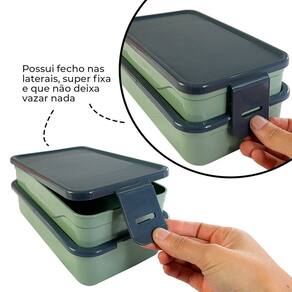 - Fechamento Seguro com Trava - Talheres Inox - Pote Empilhável, melhor organização - Divisória móvel - Livre de BPA (BPA Free) - Capacidade total: 1,3 litros. - Pode usar em micro-ondas, mas ATENÇÃO, Para uso em micro-ondas remover os talheres.