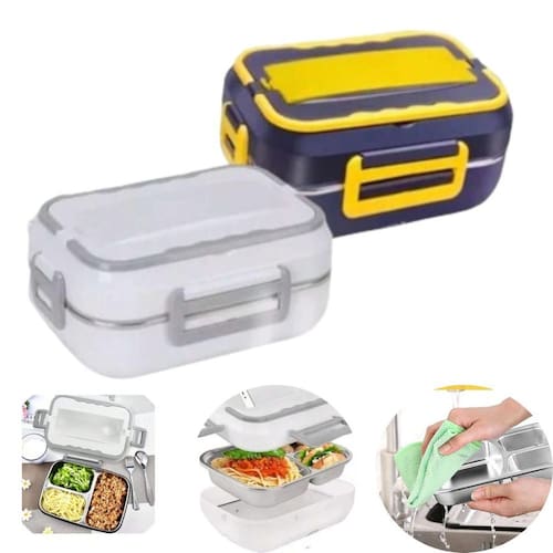 Marmita elétrica portátil com capacidade de 1.5L, aquecimento rápido (15-30 min), bivolt (110V/220V e 12V veicular), potência de 40W. Possui travas laterais, repartições, suporte para talheres e é feita de plástico PP de grau alimentício e aço inoxidável 304.Lâmpada piloto