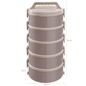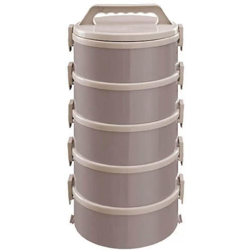 Marmita Térmica Treviso 5 Pratos Térmicos de 1,8 Litros Cappuccino Simonaggio #Presilhas para segurança no transporte #Conjunto com 5 pratos térmicos #Livre de BPA Garantia: 90 dias / Peso: 1,828kg / Cor: cappuccino e bege / Ref: 7896211864509 Dimensões totais do produto: 23cm (C) x 21,5cm (L) x 50cm (A) Dimensões internas de cada prato: 18,5cm (D) x 7cm (A) Dimensões externas de cada prato: 23cm (C) x 21,5cm (L) x 9cm (A) Capacidade de cada prato: 1,8 litros. Eficiência térmica: até 4 horas (quente/frio), dissipando o valor neste período. Conteúdo: 2 marmitas sem divisórias, 1 marmita com 1 divisória, 2 marmitas com 3 divisórias e 1 tampa. Compatível com micro-ondas (aquecer sem a tampa) Material: - Polipropileno (PP): É uma resina atóxica, de baixa densidade que oferece um bom equilíbrio de propriedades térmicas, acompanhadas de ótima resistência. - Poliestireno expandido (EPS): É uma espuma rígida, utilizada para isolação térmica. A marmita térmica possibilita transportar suas refeições para qualquer lugar. Muito usada por restaurantes e deliveries por ser leve e compacta e ter capacidade térmica de até 4 horas. O conjunto de marmitas é empilhável, basta fixar um ao outro por suas presilhas laterais super seguras. Produzido com matéria-prima 100% virgem e atóxica, não interferindo o sabor do seu alimento.