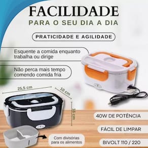 Aqueça sua comida enquanto trabalha ou dirige, no carro, caminhão, uber, escritório, casa ou escola com a marmita elétrica térmica portátil bivolt. Esta marmita é perfeita para quem busca praticidade, agilidade e conforto. Com um modelo compacto e prático, ela comporta até 1,05l de comida, ideal para levar seu jantar ou almoço completo a qualquer lugar. Use-a em seu carro, caminhão com saída 12/24v ou em casa e no trabalho com tomada 110/220v.