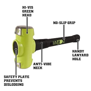 Wilton Martelo de trenó B.A.S.H 40,64 cm, cabeça de 3,6 kg (20816) - A cabeça 46 HRC de alta visibilidade patenteada e forjada em gota resiste às aplicações mais exigentes - O núcleo de aço inquebrável com tecnologia de cabo elimina a quebra durante overstrikes - O pescoço espesso e cônico anti-vibração absorve a vibração, reduzindo a fadiga do trabalhador - A placa de segurança prende a cabeça ao cabo, evitando que a cabeça se desaloje - O cabo ergonômico é moldado e engrossado para maior conforto e menos vibração - A alça de borracha vulcanizada oferece uma aderência segura e antiderrapante ao bater - O orifício do cordão permite que o usuário prenda com segurança o martelo a um pulso ou objeto estacionário