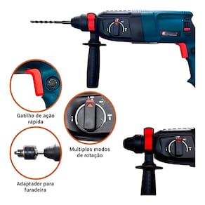 Martelete 1200w perfurador/rompedor 110v Furadeira martelo rompedor com maleta para transporte. - . Segue abaixo configuração. - encaixe mandril - função martelete impacto, com ou sem rotação - função furadeira rotação sem impacto - limitador de profundidade - encaixe para acessórios de - talhadeira / ponteira e kit brocas Informações técnicas - rotação: 1300rpm - potência: 1200watts - voltagem: 220v ou 110v - função martelete: 5100rpm - tamanho do mandril: 24mm - botão de seleção para rotação, rotação com impacto e impacto - frequência: 50/60hz - sistema reversível - modelo: nk-2603pro - marca: nakasaki Diferenciais do produto: Alça e cabo auxiliar emborrachados oferecendo maior conforto e firmeza ao operador. Medidor de profundidade Motor com dupla isolação Indicação: Indicada para uso em metal, madeira, alvenaria e concreto. Comprimento - 42,5cm Largura - 11,5cm Altura - 27,5cm Peso - 2,6kg Acompanha brocas sds Marca: Não Informado Ean: 7805783198738