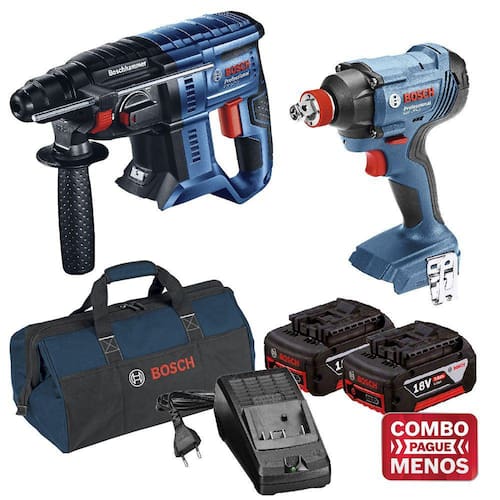 Caixa de engrenagens e escovas de carvão podem ser substituídas facilmente. + Starter Kit: 1 carregador Bivolt e 2 baterias 18V + Maletin com 3 compartimentos externos para acessórios e ferramentas manuais