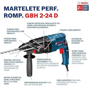 Martelete perfurador rompedor gbh2-24 bosch sem maleta com Talhadeira, ponteiro, kit brocas, adaptador e mandril -bosch gbh 2-24d professional; -maior potência para perfurar com menos esforço, agora com 820w; -longa vida útil graças a componentes de motor de alta qualidade; -vario-lock para o ajuste dos ponteiros; -embreagem de segurança contra sobrecarga e velocidade variável. Dados técnicos: -potência absorvida: 820 w; -energia de impacto: 2,7 j; -número máx. De impactos: 0 - 5100 i.P.M; -nº de rotações nominais: 0 - 1300 r.P.M; -peso: 2.8 kg; - do produto 02 anos -porta brocas: sds-plus; Faixa de perfuração: - máx. De perfuração alvenaria, brocas de coroa oca: 24 mm; - máx. De perfuração em aço: 13 mm; - máx. De perfuração em madeira: 30 mm. Acompanham: -mandril sds-plus; -empunhadeira adicional; -limitador de profundidade; -kit brocas sds plus 4 brocas marca disponível no momento do pedido ; -ponteiro marca disponível no momento do pedido ; -talhadeira marca disponível no momento do pedido ; -mandril não pode ser Utilizado com impacto do martelete, pois não aguenta ; marca disponível no momento ; -adaptador de mandril marca disponível no momento .
