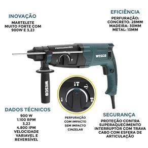 Martelete rompedor perfurador modelo ws3228k com 900w de potência Com maleta, ponteiro, talhadeira, brocas, adaptador e mandril Martelete perfurador/rompedor - 28 mm - 900 w Excelente performance e custo-benefício Dados técnicos 4 funções: perfurar com e sem impacto, rompimento e giro de 360 da talhadeira; Velocidade variável e reversível; Proteção contra superaquecimento; Cabo com de articulação para maior durabilidade; com trava de segurança. Potência nominal: 900 w; Rotação: 0-1.100 rpm; Energia de impacto: 3,2 j; Impactos por minuto: 0-4.800 ipm; Encaixe: sds-plus; Peso: 3,2 kg; Capacidade máxima de perfuração: Perfuração concreto: 28 mm; Perfuração madeira: 30 mm; Perfuração metal: 13mm. Itens que acompanham a máquina: -01 empunhadura auxiliar; -01 limitador de profundidade; -03 brocas de 6/8/10 x 150 mm; -01 ponteiro; -01 talhadeira; -01 maleta plástica; -01 adaptador de mandril; -01 mandril 1/2. Marca: Não Informado Ean: 7909463124106