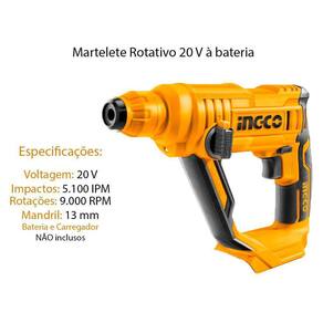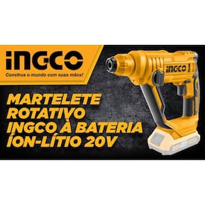 Características:A INGCO produz ferramentas de alta qualidade para uso profissional e industrial, está presente em mais de 180 países e agora também no BrasilFerramenta com luz de LED, facilitando a visibilidade em lugares mais escuros.Possui função reversa em apenas 1 botão.Especificações:Voltagem: 20 V.Rotações: 0 - 900 RPM.Impactos: 0 - 5.100 IPM.Força de Impacto: 1.5 J.Número de Funções: 2.Capacidade do Mandril:- Em Aço: 10 mm.- Em Concreto: 16 mm.- Em Madeira: 20 mm.Lanterna Integrada: Sim.Função Martelete: Sim.Conteúdo:1 Martelete Rotativo Ingco 20 V; 3 Brocas SDS-Plus e Manual.