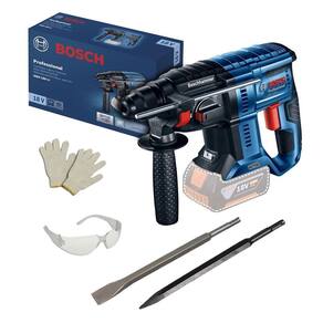 Martelete Sds Plus 18v Brush S/ Bat Gbh180-li Bosch + Acess Martelo perfurador a bateria Bosch GBH 180-LI com SDS plus, 18V Sem bateria e Sem carregador O Martelete Perfurador a Bateria Bosch GBH 180-LI,18V, é ideal para os trabalhos profissionais em construções, reformas e instalações em geral. Possui sistema de troca rápida de acessórios SDS-Plus, e proporciona 20% mais furos do sua versão anterior. Vem com motor sem escovas de carvão livre de manutenção, Com o dobro de vida útil e maior autonomia. Além disso vem com Luz de led, para trabalhar em áreas menos iluminadas. Ferramenta 100% Compatível com Baterias e Carregadores 18V Bosch. Pontos fortes da máquina: Alta performance: 20% mais furos do que sua versão anterior; Melhor custo-benefício do mercado com motor sem escovas de carvão; Velocidade variável para maior controle nas aplicações. Características técnicas: Tipo de embalagem: Caixa de papelão; Acompanha maleta Não; Fonte de Energia: Bateria; Acompanha bateria Não; Baterias são necessárias: Sim, 18V; Voltagem da bateria V : 18V; Voltagem: 110V/220V; Fonte de luz: Bateria; Composição da célula da pilha ou bateria: Íons de Lítio ou Heavy Dut: Bosch ; Dimensões do produto AxLxP : 22 x 9 x 32,5; Peso do produto sem bateria kg : 2,3; Peso do produto com bateria kg : 2,6; meses : 12; Acabamento da ferramenta / Composição da ferramenta: Poliamida, metal e elastômero; Velocidade variável Sim; Controle de Torque Não; Rolamento ou Bucha Rolamento; Diferenciais Técnicos: 20% mais furos; Nº de rotações rpm : 0 - 1800; Diâmetro max. Perfuração concreto mm : 20; Diâmetro max, perfuração concreto broca maciça mm : 20; Diâmetro max. Perfuração madeira mm : 30; Diâmetro max. Perfuração aço mm : 13; Sistema de encaixe: SDS plus Possui Impacto Sim; Força de Impacto J 2; Impacto ipm = impacto por minuto : 0 - 5100; Função rompedor Sim; 'vibração m/s Perfuração Somente Martelos ': 12,6; Técnologia do Motor: Pneumático; Modos de operação: 3 Funções. Itens que acompanham a GBH 180-LI -01 Empunhadeira; -01 Talhadeira SDS Marca disponível no momento do pedido; -01 Ponteiro SDS Marca disponível no momento do pedido; -01 Óculos de segurança; -01 Par de Luvas. Ean: 7909463116729