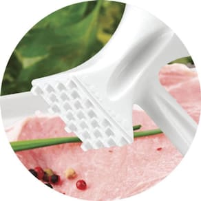 Benefícios Auxilia preparo de alimentos e temperos Também útil para amaciar bifes Um lado liso e outro com dentes Plástico de alta qualidade não quebra na hora do uso Cabeça robusta