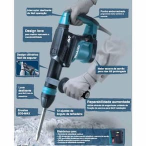 Descrição: Alta durabilidade e excelente performance na demolição. Encaixe SDS MAX para fácil troca do ponteiro. LED de alerta indica quando trocar a escova de carvão. Especificações: Potência: 1.100 watts Impactos por minuto: 1.100 - 2.650 ipm Energia de ímpacto: 11,4 joules Cabo de energia : 1,5 m Itens Inclusos: Graxa Punho lateral Maleta Não acompanha ponteiro