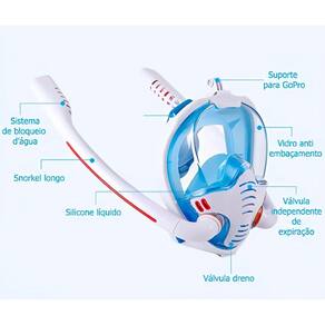 A máscara é fabricada com silicone anatômico de alta qualidade, que proporciona vedação perfeita ao rosto, evitando vazamentos e garantindo conforto mesmo em uso prolongado. A lente em vidro temperado oferece ampla visão panorâmica, resistência a impactos e excelente nitidez debaixo d’água.
