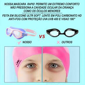 A Máscara De Natação Gold Sports Rapid Infanto - Juvenil 7.0 High Definition Característica 1. Moldura de cloreto de polivinilo com revestimento resistente a impacto. 2. Campo extra largo de visão: Nossa máscara de natação Gold Sports Infanto-Juvenil são projetados com lentes mais largas e possuem campo de visão de 180 graus. Proporciona máximo campo de visão e clareza para garantir seu filho tem uma experiência de natação mais confortável. 3. Design funcional: O novo botão de ajuste das tiras facilita o ajuste. O frame se encaixa perfeitamente, e o design mais largo distribui a pressão de forma mais uniforme, dando sua criança uma experiência de uso confortável. 4. Proteção antiembaçante e UVA e UVB 400: Nossa máscara de natação infanto-juvenil são equipados com lentes de policarbonato resistente a impacto. Todas as lentes proporcionam proteção antiembaçante e anti-UVA e UVB 400, que podem proteger os olhos do seu filho dos danos dos raios UV e proporcionar a melhor visão. 5. Os materiais mais seguros: Nossa máscara de natação é feito de silicone inodoro, hipoalergênico. O gascket da Mascara de natação possui Design 3D ergonômico encaixa perfeitamente na cavidade ocular de crianças e Adolececentes e seu silicoce e ultra soft anti alérgico. Acompanha um par de protetor de ouvido de silicone ultra soft e anti alérgico Marca: Gold Sports Composição: Poli carbonato, Silicone e PVC Garantia: 01 mês somente contra defeito de fabricação Marca: Não Informado