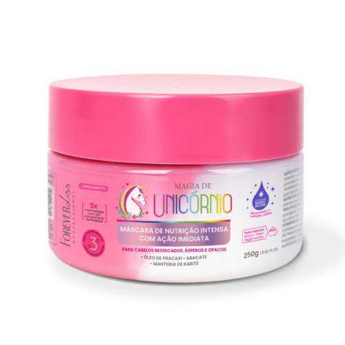 Benefícios Efeito instantâneo (3 minutos)5x mais nutriçãoTecnologia Magic Glow de brilhoTextura leve, aerada e fácil de aplicarReparação pós-solAntifrizzAntinós Contém01 - Máscara de Nutrição Magia de Unicórnio Forever Liss 250g