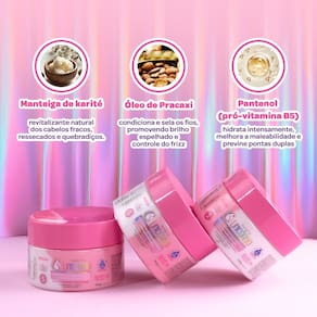 Seus ativos incluem: óleo de abacate, óleo de pracaxi, óleo de coco, extrato de babosa, pantenol e manteiga de karité, combinação perfeita para recuperar cabelos ressecados, ásperos e opacos que necessitam de uma nutrição poderosa. Além disso, a máscara traz duas cores que podem ser misturadas à vontade.