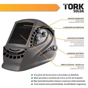 Máscara de solda automática com auto escurecimento control solar 8k cores reaisId: msea 1003A máscara de solda msea 1003 super tork é o conjunto de segurança e tecnologiaVisor de alta definição 8k, cores reais que permitem ao soldador realizar soldas mais precisas, fácil visão no processo de soldagem.Não é necessário remover o capacete para enxergar os resultados, a tecnologia 8k oferece nitidez e clareza ao soldador. Ganho na produtividade e acabamentoMáscara ideal para soldas mma eletrodo revestido, tig, mig mag e corte plasma.Recursos da máscara de solda msea 1003: Ideal para soldas mma eletrodo revestido, tig, mig mag e corte plasma; Bateria econômica com a placa solar frontal; Tempo de resposta de 0,0001 segundos; Controle de escurecimento externo; Ajuste sensibilidade externo; Controle tonalidade externo; Função esmerilhadeira Nível de escurecimento din: 5 13 4 sensores de abertura; Amplo visor 100x35 mm; Indicador de baixa bateria; Bateria removível; Acompanha: 01 bateria extra, 01 lente interna extra e 01 lente externa extra.Dados técnicosCa: 47.303Área de visão: 100x35mmProteção uv/iv: escurecimento din 16 constanteEstado visível: escurecimento din 4Escurecimento: din 13Tempo de polarização: 0,0001 segundosTempo de despolarização: 0,2 1,0 segundosPeso: 0,54 kg