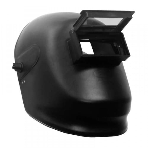 Mascara de Segurança, composta de escudo confeccionado em celeron, com carneira de plástico com regulagem de tamanho através de ajuste simples ou através de catraca. O escudo é fabricado com visor articulado e suporta uma placa de cobertura e o filtro de luz. O filtro de luz é confeccionado em vidro de tonalidade 10 à 14, e as placas de cobertura e de segurança, confeccionadas em vidro transparente, que são fixadas ao visor através de uma mola plástica encaixada em fendas internas do visor. O escudo é preso a carneira através de dois parafusos plásticos.