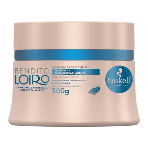 Máscara de Tratamento Haskell Bendito Loiro 300g Indicação: cabelos descoloridos. Proporciona tratamento profundo de regeneração dos fios loiros e restaura os cabelos dos danos causados pelo processo