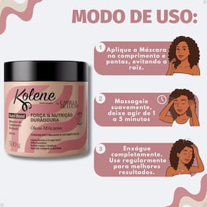 Após lavar os cabelos com o shampoo de sua preferência, aplique a Máscara De Tratamento Profundo Kolene Nutri Bond no comprimento e nas pontas dos fios, evitando a raiz. Deixe agir de 3 a 5 minutos para que os ativos penetrem profundamente. Em seguida, enxágue bem, removendo todo o produto.