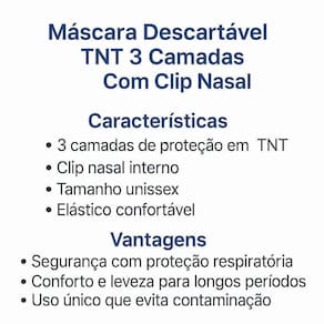 2 pacote de 50 unidades de Máscara Descartável Adulto Tripla Com Elástico e Clip Nasal - 100 unidades Estilo e proteção no seu dia a dia Máscara descartável de TNT com tripla camada, ideal para uso diário em ambientes públicos ou profissionais. Confortável, leve e respirável. Tamanho adulto unissex Tripla camada de proteção Clip nasal ajustável Elástico macio Para uso no transporte, trabalho, lojas e mais Uso único produto higiênico e seguro Quantidade na embalagem: 50 unidades ou ajustar