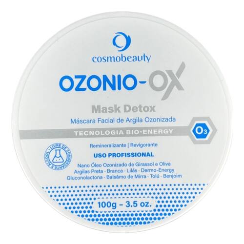 Ozonio-Ox Mask Detox promove a purificação cutânea através da remoção de impurezas que desgastam a pele. Atua na hidratação, revitalização e suavidade.Benefícios e característicasHidratanteRevitalizanteSuavizanteDetoxRevigoranteRemineralizanteAtivosNano Óleo Ozonizado de Girassol e OlivaArgila PretaArgila BrancaArgila LilásDermo-EnergyGluconolactonaBalsâmo de MirraTolúBenjoimModo de usoSobre a pele limpa e seca, aplicar uma camada Ozonio OX Mask Detox em toda região desejada e deixar agir por 10 minutos. Após, retirar completamente com água.