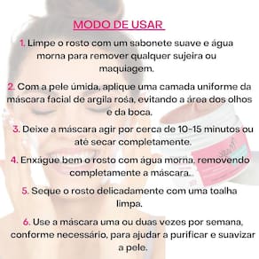Modo de usar: Limpe o rosto com um sabonete suave e água morna para remover qualquer sujeira ou maquiagem. Com a pele úmida, aplique uma camada uniforme da máscara facial de argila rosa, evitando a área dos olhos e da boca. Deixe a máscara agir por cerca de 10-15 minutos ou até secar completamente. Enxágue bem o rosto com água morna, removendo completamente a máscara. Seque o rosto delicadamente com uma toalha limpa. Use a máscara uma ou duas vezes por semana, conforme necessário, para ajudar a purificar e suavizar a pele. Evite o contato com os olhos. Se ocorrer irritação, interrompa o uso.