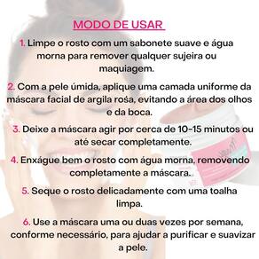 Modo de usar: Limpe o rosto com um sabonete suave e água morna para remover qualquer sujeira ou maquiagem. Com a pele úmida, aplique uma camada uniforme da máscara facial de argila rosa, evitando a área dos olhos e da boca. Deixe a máscara agir por cerca de 10-15 minutos ou até secar completamente. Enxágue bem o rosto com água morna, removendo completamente a máscara. Seque o rosto delicadamente com uma toalha limpa. Use a máscara uma ou duas vezes por semana, conforme necessário, para ajudar a purificar e suavizar a pele. Evite o contato com os olhos. Se ocorrer irritação, interrompa o uso. Marca: Não Informado Ean: 7898920512078