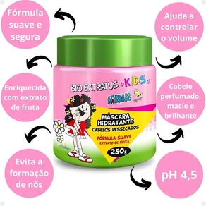 Misturinha especial, cuidadosamente preparada para hidratar os cabelos delicados das crianças. Fórmula suave e segura, enriquecida com extrato de fruta. Nutre, protege, hidrata e desembaraça com alegria. Deixa um cheirinho delicioso e ajuda a controlar o volume dos cabelos ressecados. pH 4,5. Dermatologicamente testado. Não testado em animais.