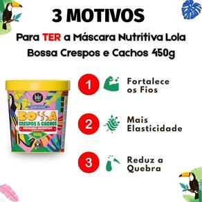A Máscara Nutritiva Lola Bossa Crespos e Cachos é perfeita para a sua rotina de cuidados capilares, sendo ideal para uso regular em cabelos crespos, cacheados e com frizz que necessitam de nutrição intensa e revitalização. Utilize-a sempre que seus fios pedirem um tratamento extra de maciez, brilho e definição, seja após a lavagem ou como um booster nutritivo semanal.