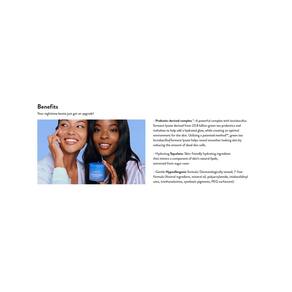 - Uma máscara para dormir durante a noite, formulada com bioma do sono e esqualano nutritivo para ajudar a fortalecer a barreira de hidratação da pele e aumentar o brilho e a clareza.