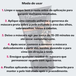 Modo de usar a Máscara Preta Facial Peel-Off: Limpe e seque bem o rosto antes da aplicação para garantir melhores resultados. Aplique uma camada uniforme e generosa da máscara preta sobre a pele evitando a área dos olhos, sobrancelhas, lábios e cabelos. Deixe a máscara agir por cerca de 15-20 minutos ou até secar completamente. Após secar, comece a remover a máscara delicadamente a partir das bordas, puxando-a para cima em direção à testa. Enxágue qualquer resíduo da máscara que permanecer na pele com água morna. Finalize aplicando seu hidratante facial favorito para manter a pele hidratada após o procedimento. Dica: Utilize a máscara uma ou duas vezes por semana, dependendo das necessidades da sua pele, para remover impurezas, oleosidade e células mortas, deixando-a com uma aparência mais suave e revitalizada Ean: 7898920498570