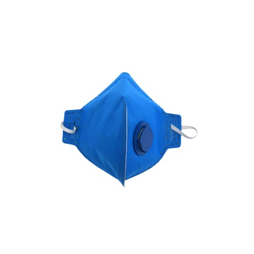 Respirador tipo peça semifacial filtrante, dobrável no tamanho único, com válvula de exalação. Composta por uma manta em tecido não tecido na face interna (contato com o rosto do usuário) na cor branca e uma manta em tecido não tecido na face externa na cor azul.