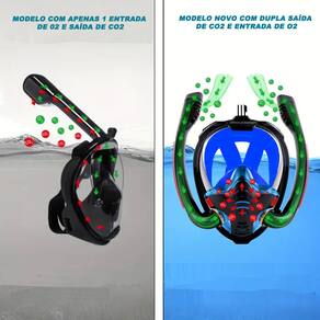 Mascara Subaquática de de Mergulho Gold Sports Full Face Maui Double Snorkel fazer você respirar mais suave em comparação com tubo único snorkel. Alimentando a circulação de ar fresco pela boca e nariz juntos, canais de ar para maximizar o fluxo de ar e garantir que a máscara permaneça livre de névoa, também impede que a água salgada entre na boca e evita engasgos.