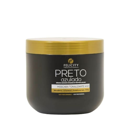 CONTÉM01- Máscara Ativadora de Tons Preto Azulado Felicity Professional 500grDESCRIÇÃOA Máscara Revitalizante Preto Azulado Felicity proporciona a hidratação, entrega brilho e aumenta a durabilidade da cor dos cabelos pretos, possui forula elaborada com um sistema unico a base de Macadamia, D-pantenol e proteina da seda, que proporcionam Condicionamento, Brilho, uniformidade e durabilidade da cor.Tem o papel fundamental de devolver a pigmentação natural ou artificial de forma gradativa dos fios castanhos e pretos reavivando a cor dos fios ao mesmo tempo em que hidrata e nutre.É possível ter os seus cabelos pretos azulados, pretos ou em tons de castanho escuros de volta em poucos minutos, além do brilho extremo aos fios!Compatível com outras químicas, principalmente progressivas e alisamentos, podendo ser utilizada no mesmo dia.  Modo de Usar: Com os cabelos limpos e úmidos, aplicar a MÁSCARA ATIVADORA DE TONS PRETO AZULADO FELICITY PROFESSIONAL sobre os fios uniformemente, espalhando com ajuda de um pente. Deixar agir por até 20 minutos, acompanhando a tonalização desejada. Enxaguar abundantemente. Finalize como Desejar.É recomendado o uso de luvas durante a aplicação. Tecnologia: Macadamia:o óleo de macadâmia proporciona uma maior nutrição dos fios deixando-os mais fortes e hidratados, o que resulta em cabelos mais saudáveis, sedosos, macios, com volume controlado, fáceis de pentear e com muito mais brilho.D'Pantenol: Oferece Hidratação Máxima nos fios proporcionando maciez, conduzindo brilho e reavivando a cor dos fios.Proteína da Seda: hidrata e melhora a força elástica capilar, formando um filme nos cabelos.  Benefícios: - Brilho extremo;- Hidrata e reaviva tons escuros;- Tonalização gradativa dos fios;- Cor intensa de cabelos escuros;- Revitaliza e fortalece os fios, deixando-os com brilho intenso;- Compatível com qualquer tipo de química;- Capacidade de neutralizar os reflexos indesejados.É recomendado o uso de luvas durante a aplicação. Precauções: Manter fora do alcance de crianças. Em caso de irritação, suspenda o uso imediato e procure um médico. Em caso de contato acidental com os olhos, lave com água abundante.