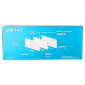 Máscaras descartáveis tripla clipe nasal kit 100un uniqmed Tamanho: 17,5x9,5 Máscara cirúrgica descartável tripla camada com clipe nasal ajustavel uniqmed - kit 100 máscaras A máscara cirúrgica descartável uniqmed é indicada para proteção do usuário contra os patógenos de transmissão aérea por gotículas, projeção de fluidos corpóreos, partículas que flutuam no ar, oferecendo ainda proteção contra poeira, fumaça, poluição atmosférica, produtos químicos e alérgenos. - proteção de tripla camada com filtro - alta eficiência na filtragem de partículas e bactérias - 99% de eficiência na filtragem de bactérias - 99% de eficiência na filtragem de partículas - com pregas horizontais e clipe nasal ajustável - tnt de alta qualidade - elástico confortável e macio Características: - marca: uniqmed - medida: 17,5cm x 9,5cm - cor: branca - tipo iir: medical mask - origem: china - quantidade: 50 unidades por caixa , neste kit são 100un. - uso: descartável uso único descartável, destruir após o uso. Proibido reprocessar - validade: 3 anos após a fabricação - composição: tecido não tecido de uso odontólogas-médico-hospitalar 100% polipropileno, produzido através do processo sms spunbond + meltblown + spunbond . Clipe nasal: tira de alumínio maleável, revestida com plástico. - produto não estéril Certificações de qualidade: - registro: anvisa 80155470392 - iso: 13485 - exigência abnt nbr 15052:2004 Cuidados: - uso único; - não utilizar após o prazo de validade; - não recomendado para crianças menores de 3 anos; - manter longe de alcance de crianças; - descartar o produto imediatamente após o uso, conforme legislação vigente. - não reutilizar; - não usar em caso de sensibilidade ao tnt, alergias, dificuldade respiratória ou locais de baixa ventilação;- armazenar em temperatura ambiente e umidade relativa do ar máxima de 80%; - evitar exposição à alta temperatura e luz solar direta.