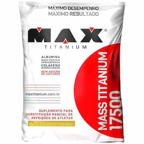 Mass Titanium 17500 3kg - Max Titanium Descrição É um suplemento alimentar compensador, desenvolvido com os nutrientes necessários para atletas que querem ganhar massa muscular. Este é o HIPERCALÓRICO. Fonte de carboidratos simples e complexos, os hipercalóricos são utilizados como fonte de energia, evitando o catabolismo muscular. Mass Titanium 17500 contém, em sua fórmula exclusiva, quatro tipos de proteínas com alto valor biológico: WHEY PROTEIN ISOLADO, WHEY PROTEIN CONCENTRADO, COLÁGENO E ALBUMINA. Esses ingredientes garantem um grande avanço na suplementação, já que são as principais substâncias do crescimento muscular. Apresentação: Embalagem PET Branca e tampa com lacre de segurança. Contém 100 Caps Prazo de validade 24 meses Benefícios Proporciona o aumento de peso e Massa Muscular; Ação contra o metabolismo (acelera a recuperação muscular); Alto teor de proteínas e aminoácidos. Ingredientes : Maltodextrina, proteína concentrada do soro do leite (WPC), colágeno hidrolisado, clara de ovo desidratada (albumina), aromatizante, edulcorantes ciclamato de sódio e sacarina sódica, corante artificial amarelo crepúsculo. NÃO CONTÉM GLÚTEN. Recomendações de Uso: -Bata no liquidificador 160g (13 colheres de sopa) em 250ml de leite integral, desnatado ou água mineral. Para melhores resultados, utilize Mass Titanium 17500 antes e depois do treino, ou conforme a orientação do nutricionista. Cuidados de Conservação: - Conservar ao abrigo de luz solar, calor e umidade. Após aberto, manter a embalagem bem fechada em local seco e arejado. Precauções: - Gestantes, nutrizes, crianças, idosos e portadores de qualquer enfermidade, devem consultar o médico ou nutricionista. INFORMAÇÃO NUTRICIONAL Porção de 160g (5 dosadores) Quantidade por porção%VD*Valor energético604kcal = 2537kJ30Carboidratos132g44Proteínas17g23Gorduras totais0,9g2Gorduras saturadas0,4g2Gordura trans0g--Fibra alimentar0g0Sódio183mg8Cálcio151mg15* % Valores Diários de referência com base em uma dieta de 2000kcal ou 8400kJ. Seus valores diários podem ser maiores ou menores dependendo de suas necessidades energéticas. -- Valor Diário não estabelecido.