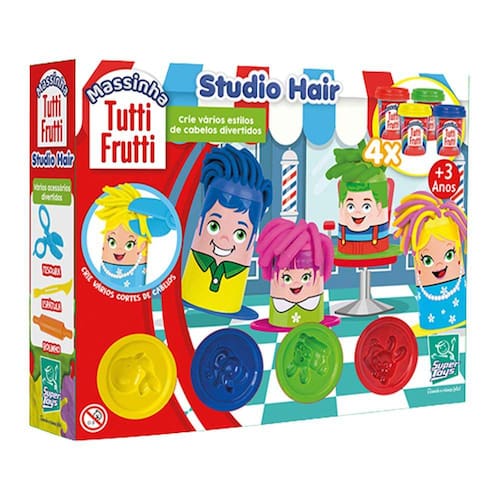 Massa de Modelar - Tutti Frutti - Studio Hair - Super Toys: prepare-se para a brincadeira mais legal de todos os tempos! Você está pronto? Se divirta com o Studio Hair e 4 potinhos de massinha. O salão possui 4 bonequinhos para colocar a massinha dentro para a brincadeira ficar mais divertida! Crie vários cortes de cabelo diferentes para cada personagem. Informações: • Produto: Massa de Modelar Tutti Frutti Studio Hair • Marca: Super Toys • Coleção: Tutti Frutti • Tipo: Massa de Modelar • Categoria: Artes e Atividades • Conteúdo: 4 massinhas de 50g, 4 forminhas, 2 êmbolos, 1 tesoura, 1 espátula e 1 rolinho • Recomendação: para crianças a partir de 03 anos de idade Especificações: • Referência: 539 • Código de Barras: 7898395335394 • Embalagem (C x A x L): 27,5 x 21 x 06 cm • Embalagem (Peso): 0.465 kg • Material / Composição: Plástico • Registro: CE-BRI/INNAC - 00186/000 NM 300/2002 • Certificado: Órgãos Autorizados - OCP´S (Organismos de Certificação de Produtos) Benefícios de brincar: • Eleva a autoestima • Exercita a memória • Estimula o raciocínio • Exercita o imaginário • Desenvolve a criatividade • Desenvolve percepção visual • Desperta a atenção e curiosidade • Desenvolvimento neuropsicológico • Estimula habilidades motoras básicas • Incentiva a comunicação e linguagem • Desenvolve aspectos emocionais e afetivo • Estimula o reconhecimento de formas e cores Aviso: • As imagens são meramente ilustrativas • Os pesos, tamanhos e medidas são aproximados • As cores e estampas dos produtos podem ter variações • As informações são de responsabilidade do fabricante ou fornecedor