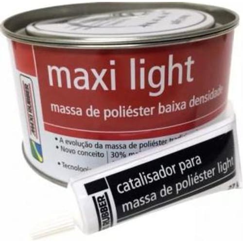 Massa de poliéster maxi light 900g com catalisador 27g maxi rubber Indicado para o reparo e correções em superfície ferrosas, galvanizadas, zincadas e em alumínio devidamente preparados. Pode ser aplicada também em fibra de vidro e madeira.